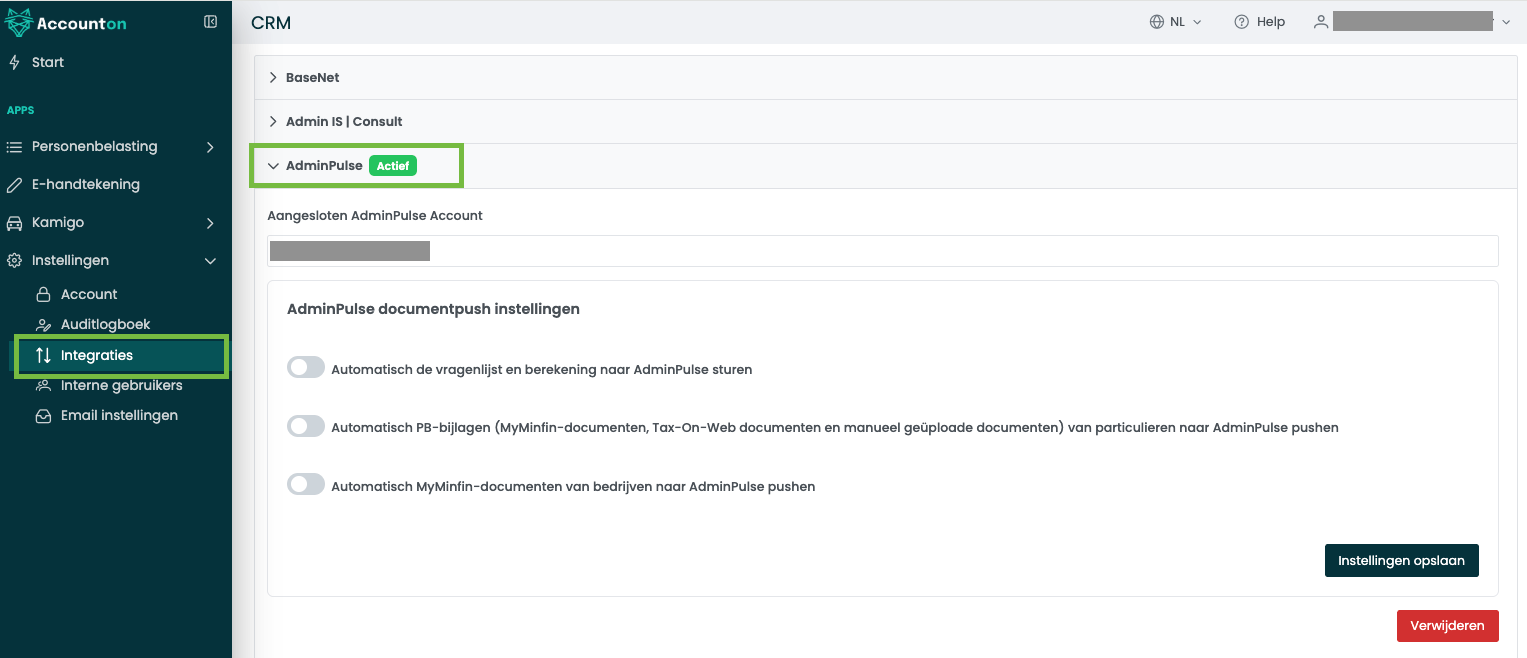 - Activeer de integratie met AdminPulse als deze nog niet actief zou zijn. U kan dit eenvoudig doen door op de knop 'Connecteer AdminPulse' te klikken en vervolgens eenmaal in te loggen in AdminPulse.