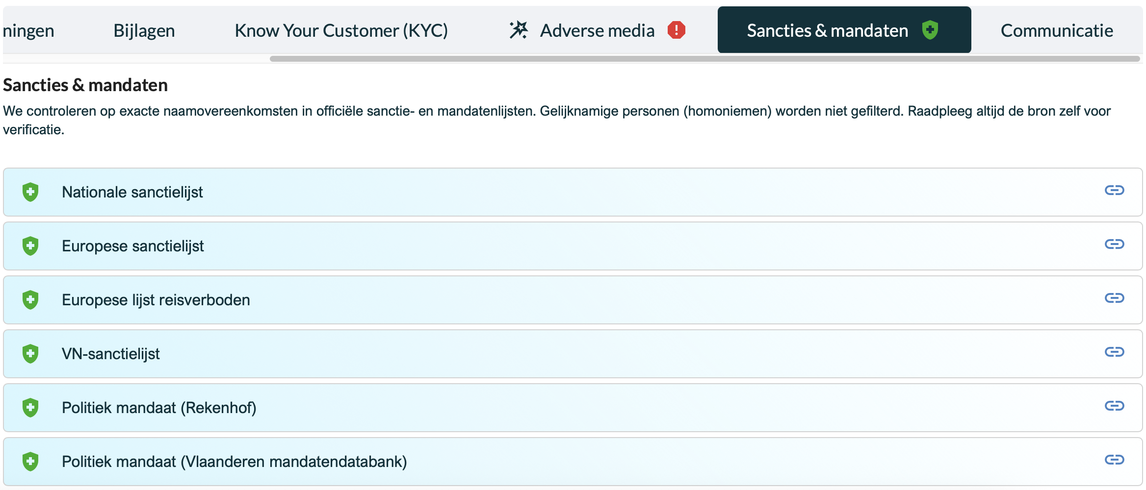 We controleren exacte overeenkomsten van naam in officiële sanctie- en mandatenlijsten.