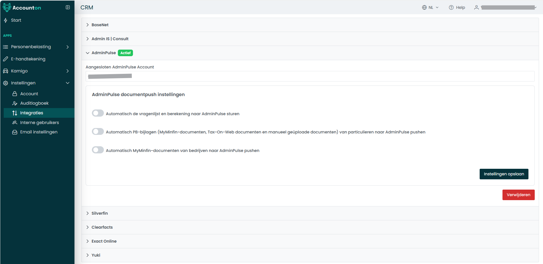 Belangrijk! Wenst u graag de MyMinfin-documenten van bedrijven die Accounton binnenhaalt, terug te sturen naar AdminPulse? Zet dan meteen ook de 3de toggle aan 'Automatisch MyMinfin-documenten van bedrijven naar AdminPulse pushen' en klik op 'Instellingen opslaan'.
