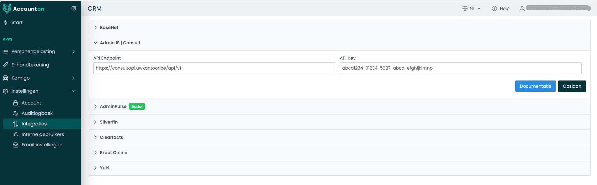 Vul de API Key (uit stap 1) en het API Endpoint (uit stap 2) in in Accounton onder ‘Instellingen’ > ‘Integraties'.