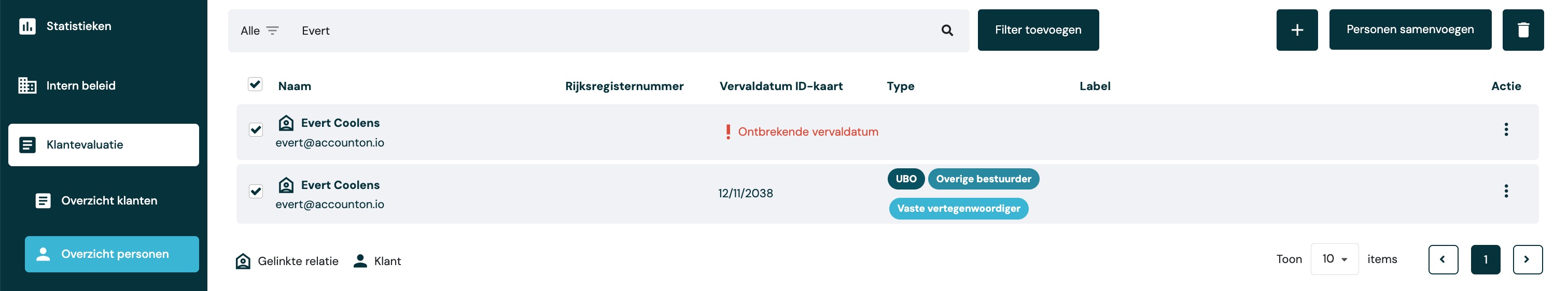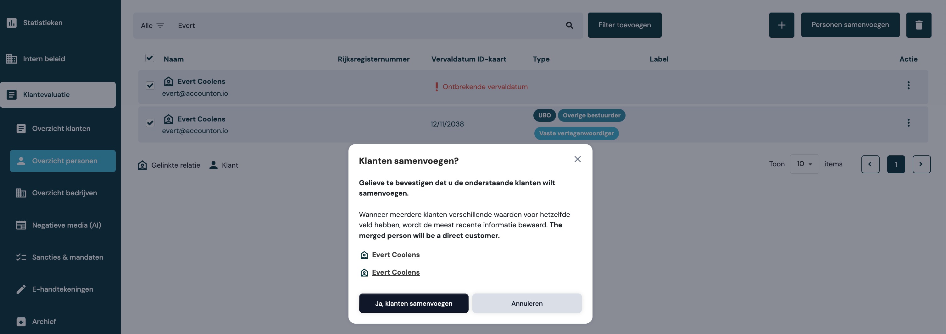 Vanaf deze update kan u zelf klanten samenvoegen vanuit het overzicht van personen of bedrijven. AMLCare voert hierbij automatisch intelligente controles uit. Personen kunnen enkel met andere personen worden samengevoegd en bedrijven enkel met andere bedrijven. Daarnaast voorkomt het systeem dat klanten met verschillende rijksregisternummers of verschillende KBO-nummers worden samengevoegd. Voor personen fungeert het rijksregisternummer steeds als leidende sleutel, voor bedrijven het KBO-nummer.