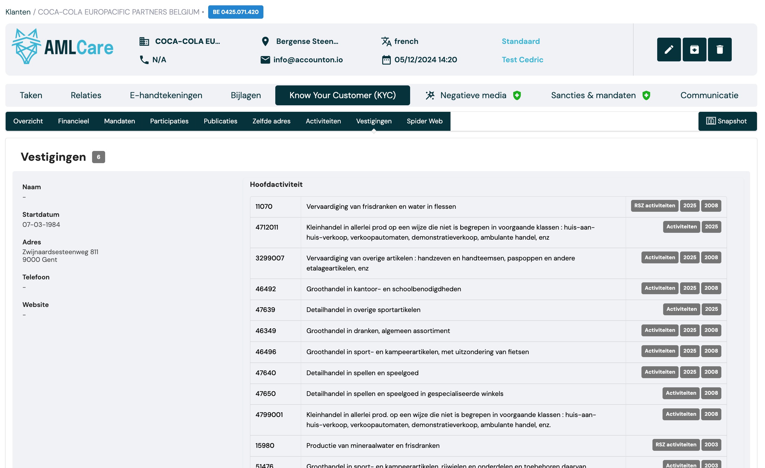 Na de samenvoeging blijven enkel het leidende persoon- of bedrijfsdossier en de geconsolideerde gegevens zichtbaar in AMLCare. Dit zorgt voor overzichtelijkere klantendossiers en voorkomt fouten of inconsistenties in latere AML-processen.