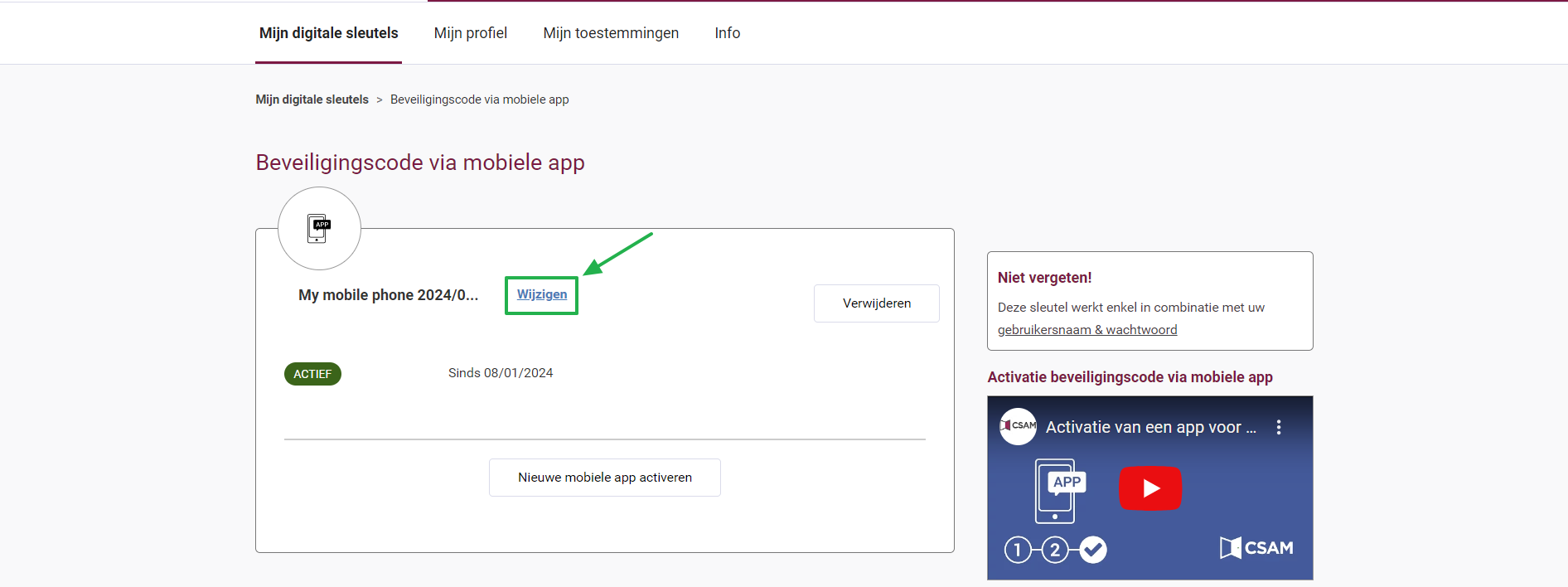 - Bij de digitale sleutel die u zonet heeft aangemaakt, klik op "Wijzigen"